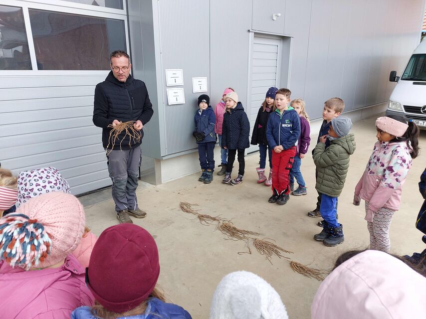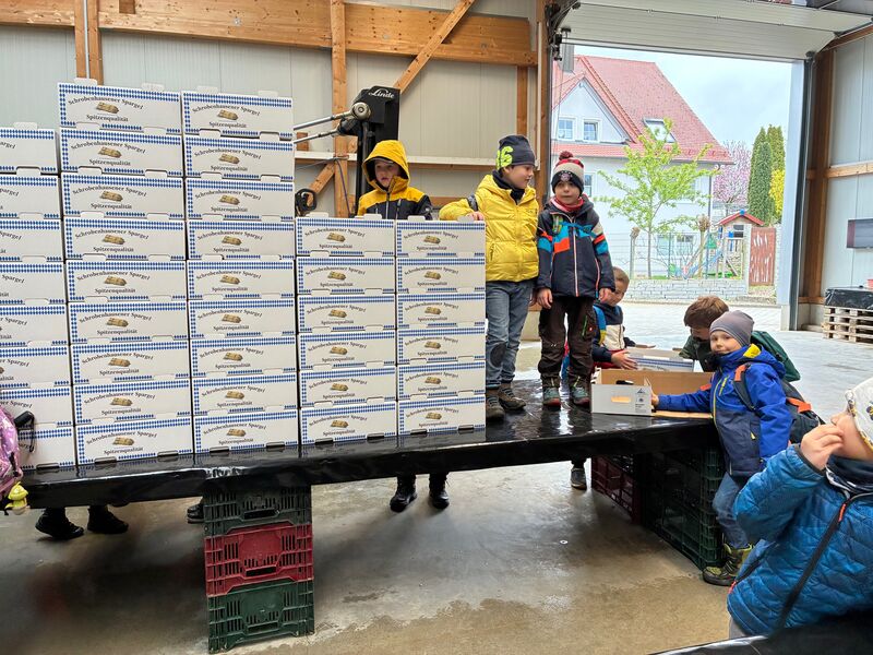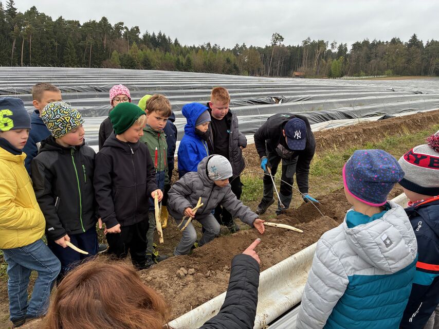 Im Rahmen der Schulung von „Alltagskompetenzen“ durften alle zweiten Klassen am 14.4.2026 gemeinsam den Spargelhof der Familie Tyroller in der Högenau besuchen. Neben zahlreichen interessanten Informationen rund um den Spargel-Anbau, konnte jedes Kind das Spargelstechen ausprobieren. Nachdem die Schälmaschine, das Sortieren und alle Vorgänge angeschaut und fleißig Kartons für den Spargeltransport gefaltet wurden, gab es als Abschluss eine leckere Spargelsuppe. Ein herzliches Dankeschön an Familie Tyroller für die tolle Betreuung den ganzen Schultag über! Die Kinder haben viel Einblick in den Arbeitsalltag gewonnen und waren mit großer Freude dabei.